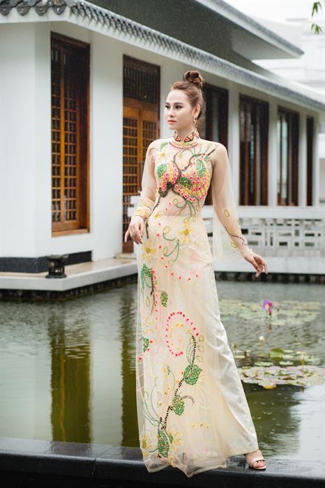 Các thiết kế sử dụng chất liệu voan xuyên thấu được đính kết hàng ngàn viên pha lê, đá quý. Không những vậy còn được thêu tay 3D kỳ công tạo nên tác phẩm thời trang sống động. Thiết kế làm nhiệm vụ tôn da, tôn dáng nhưng vẫn tuân thủ theo nguyên mẫu áo dài truyền thống phù hợp cho những sự kiện sang trọng.
