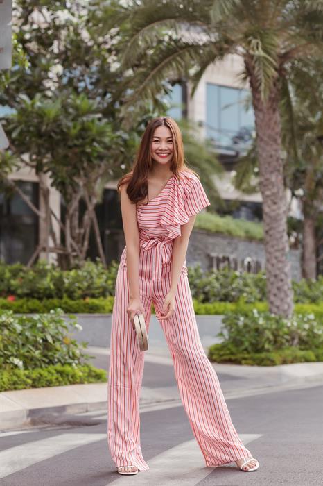 Một bộ jumpsuit cá tính hở một bên vai được siêu mẫu họ Phạm trưng dụng cho những ngày nắng nóng. Điểm nổi bật của jumpsuit chính là “ăn gian” chiều cao, chính vì vậy các cô gái chỉ cần khoác trên mình bộ cánh này sẽ “auto đẹp”