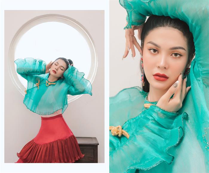 Với tiêu chí kín đáo, vải gấm màu sắc hợp không gian mùa xuân. Kiểu tóc cổ điển và lối trang điểm sắc nét giúp nữ ca sĩ nổi bật trong từng khung ảnh. Những trang phục kín đáo, mang màu sắc tươi mới sẽ là những trang phục lý tưởng cho các cô gái có thể xúng xính ăn diện cho dịp Lễ chùa những ngày đầu năm.