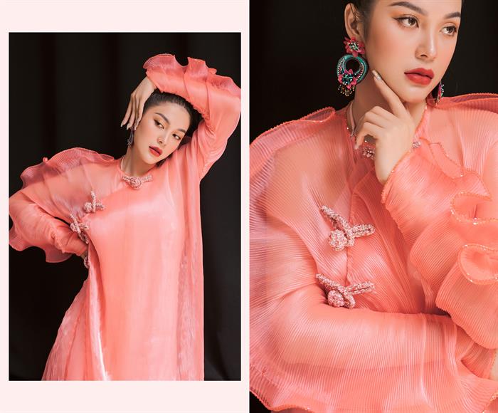 Áo dài được cách tân mạnh trong kiểu dáng và xử lý tinh tế trên nền chất liệu gấm, lụa mang lại vẻ trẻ trung cho người mặc. Thiết kế sử dụng gam màu nổi như cam, hồng cộng với kỹ thuật đính kết hoa tinh xảo trên toàn thân áo mang lại sức sống phơi phới cho những ngày đầu năm mới.