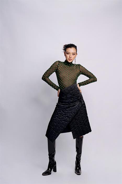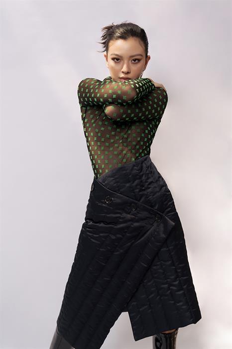 Ngay hình ảnh đầu tiên, Tú Hảo đã gây choáng khi chọn cho mình những item tưởng chừng “khó nhằn” để kết hợp nên một set đồ có 1-0-2. Với chiếc áo họa tiết neon, chất liệu xuyên thấu và chân váy lệch tà, phom xốp dày dặn, cô nàng bộc lộ rõ gu thời trang cực “đỉnh”. Bên canh đó, những phụ kiện đi kèm như hoa tai dây chữ, boots da bóng cũng góp phần củng cố cho tổng thể chất hơn.