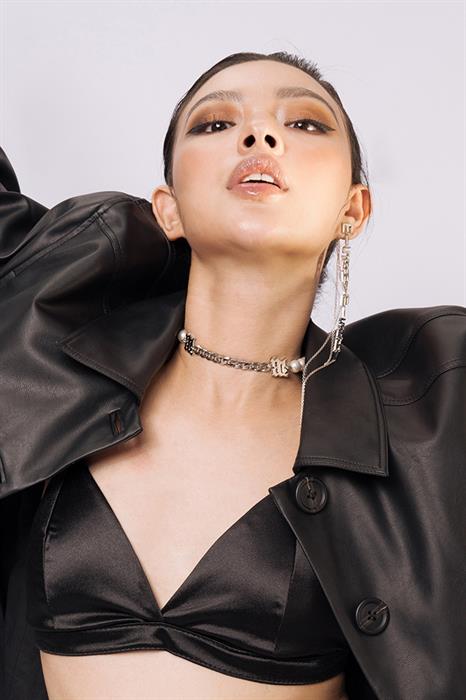 Chọn độc một gam màu đen đơn giản, Tú Hảo có phần khéo léo khi khoe sắc vóc cuốn hút trong set đồ tổ hợp những iteam cực trendy. Khoác lên mình chiếc long coast chất da cùng quần âu bóng bo cổ chân, cô nàng quán quân lại ghi điểm phá cách khi kết hợp chiếc bralette lụa.