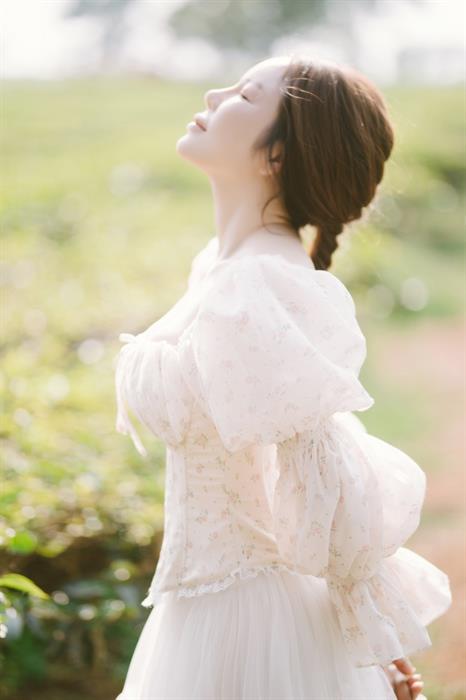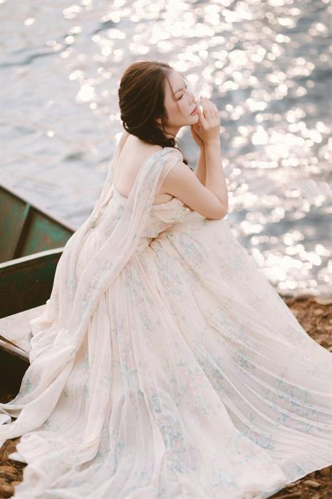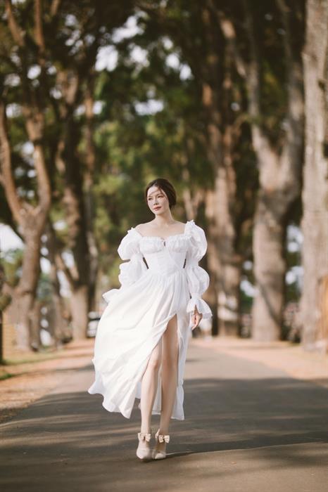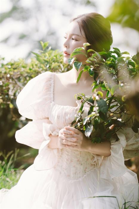 Mở đầu hành trình là Biển Hồ Chè, nơi những đồi chè xanh mướt trải dài tít tắp, ôm trọn lấy lòng hồ trong veo. Không khí trong lành, cảnh sắc yên bình tựa một bức tranh thủy mặc. Giữa không gian thanh khiết ấy, Lý Nhã Kỳ xuất hiện như một nàng thơ. Cô khoác lên mình một chiếc đầm maxi màu trắng tinh khôi chất liệu mềm mại bay bổng trong gió. Thiết kế gợi nhớ đến những nàng thơ thời tân cổ điển, hòa quyện với màu xanh của lá chè non. Mái tóc buông xõa tự nhiên, trang điểm trong suốt nhấn vào đôi môi căng mọng. Hình ảnh Lý Nhã Kỳ đứng giữa những luống chè, đôi mắt nhìn xa xăm ra mặt hồ phẳng lặng, tạo nên một khung cảnh vừa thanh lịch, vừa lãng mạn, tôn vinh vẻ đẹp dịu dàng, thuần khiết và sự giao hòa tuyệt đối với thiên nhiên. Bộ ảnh ở đây không chỉ khoe trang phục, mà còn kể câu chuyện về sự thư thái, tĩnh tại trong tâm hồn.