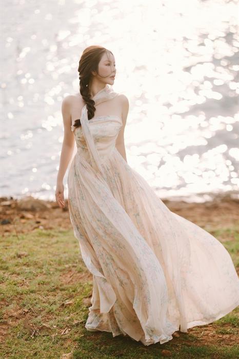 Biển Hồ T’nưng, “đôi mắt Pleiku”, mênh mông và xanh biếc, mang vẻ đ ẹp khoáng đạt và đầy sức sống. Bối cảnh này là nơi lý tưởng để Lý Nhã Kỳ thể hiện sự quyến rũ, phóng khoáng. Cô diện chiếc váy cúp ngực với tà váy dài thướt tha bên mép hồ. Gam màu xanh của bầu trời và mặt nước làm nền hoàn hảo cho tông màu pastel nhẹ nhàng. Hình ảnh Lý Nhã Kỳ đứng bên bờ hồ, mái tóc tết đong đưa trong gió, ánh mắt nhìn về phía mặt nước bao la, tựa như một nữ thần xuất hiện từ làn nước trong xanh, vừa quyến rũ, vừa bí ẩn.