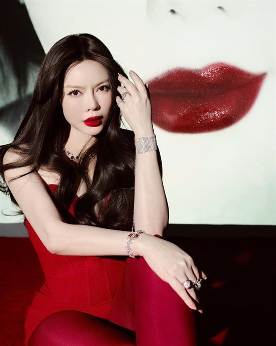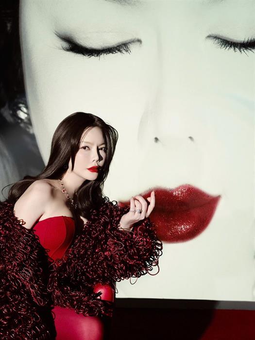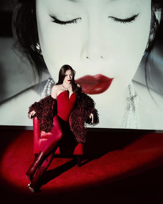Trong một set đồ khác màu đỏ rực, Lý Nhã Kỳ khoe dáng nóng bỏng với phông nền lớn sau lưng là khuôn mặt và đôi môi đỏ thẫm của chính mình. Phông nền độc lạ này đã giúp cho bộ ảnh thêm phần cuốn hút, khán giả cũng có thể xem cận đôi môi trái tim đầy đặn quyến rũ và gương mặt trái xoan mịn màng của người đẹp.