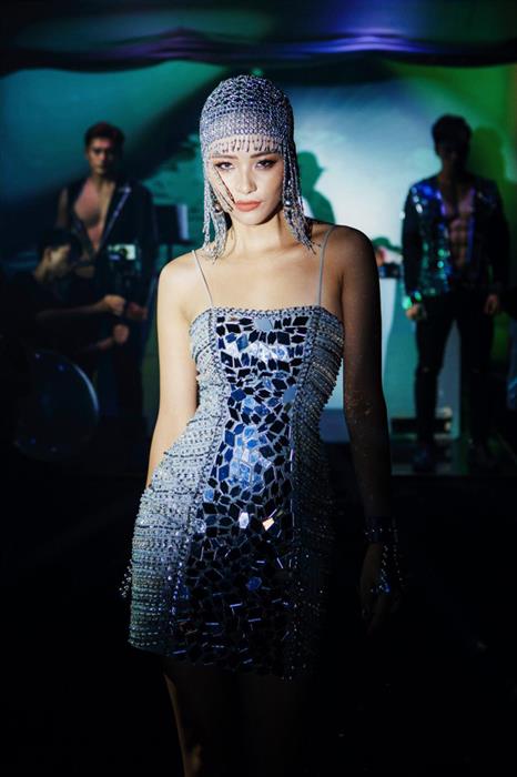 Vẫn sử dụng các gam màu ánh kim cơ bản như ánh vàng đồng và ánh bạc nhưng nét táo bạo chính là những đường cut -out gấp nhọn nổi bật ở vai biến nàng như một – nơi quyền lực ngự trị, biến nàng thành chiến binh gai góc, tràn đầy sức sống mãnh liệt và cá tính mạnh mẽ.