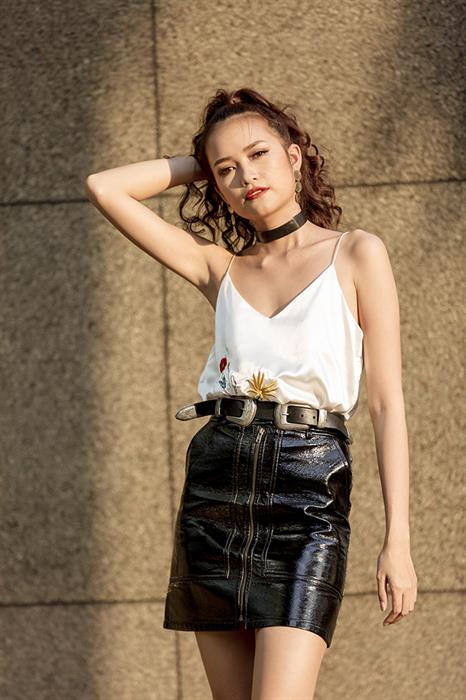 Ngọc Châu lựa chọn chiếc áo dây, phối cùng chiếc váy da thời thượng, đi cùng những món phụ kiện hot trong mùa xuân hè 2018: đôi boots da cao gót, thắt lưng to bản, vòng cổ choker, tất cả phối với nhau vừa đủ để tạo nên một hình ảnh khỏe khoắn và năng động trong những ngày xuống phố.