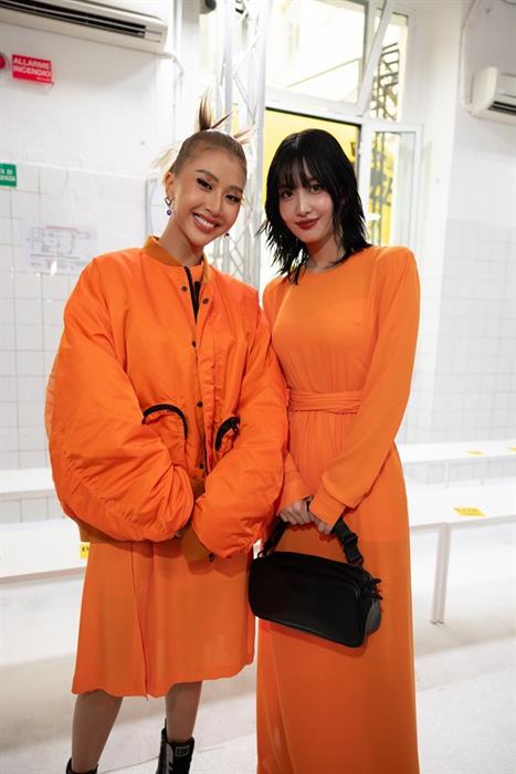 Nếu hồi tháng 2, Quỳnh Anh Shyn và stylist Nam Phùng từng xuất hiện nổi bật tại show Onitsuka Tiger Thu Đông 2023 với mái tóc nhuộm đỏ cùng trang phục trắng, thì trong lần trở lại này, Quỳnh Anh Shyn chọn sắc cam rực rỡ không kém. Kết hợp váy và áo khoác bomber, Quỳnh Anh Shyn ghi điểm cùng phụ kiện “nhỏ mà có võ” và không quên tận dụng mái tóc – vũ khí “ruột” của mình để tạo kiểu búi lạ mắt. Nữ fashionista còn trang điểm mắt phá cách khi nhấn nhá thêm những chấm cam cùng tông màu với bộ đồ.