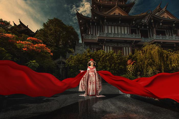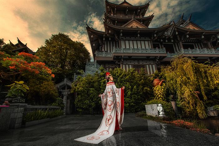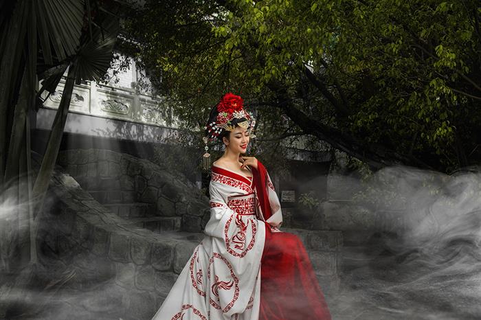 Khác với những bộ ảnh hóa thân Võ Tắc Thiên trước đây của một số người đẹp thường chụp trong studio, nhiếp ảnh gia Nguyễn Trường chọn concept chụp ngoại cảnh trong một khu vườn tĩnh mịch có nét cổ kính với không gian của một buổi chiều tà. Cô gái trong bức ảnh hiện lên rất đẹp, ma mị, nhưng có vẻ gì đó khá lẻ loi và cô độc.