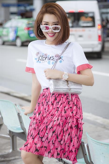 Thúy Ngân diện set đồ tông hồng ngọt ngào xuống phố. Nữ diễn viên phối áo thun kèm chân váy họa tiết xếp li và giày sneaker, cho vẻ ngoài năng động, trẻ trung. Nàng “Hân hoa hậu” còn bổ sung loạt phụ kiện hàng hiệu gồm mắt kính, đồng hồ, túi xách.