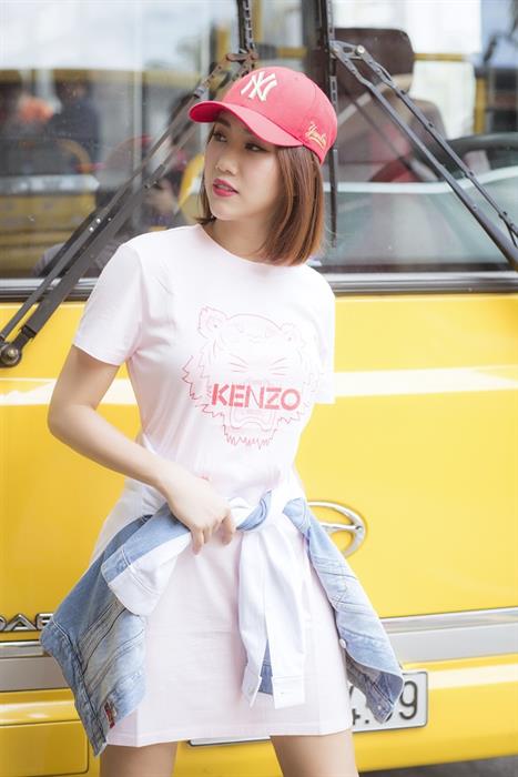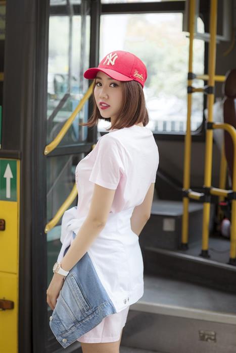Thúy Ngân không ngại thử nghiệm nhiều phong cách thời trang khác nhau. Người đẹp trông trẻ trung như gái 18 với váy ngắn gam hồng, áo khoác jeans buộc ngang hông và mũ lưỡi trai. Mái tóc chấm vai và nụ cười rạng rỡ cũng giúp Thúy Ngân thu hút mọi ánh nhìn.