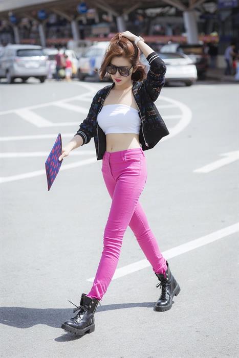 Thúy Ngân lăng xê mốt áo quây, khoe khéo ngực đầy và vòng eo thon gọn. Mỹ nhân gốc Tiền Giang còn trở nên nổi bật giữa đường phố nhờ áo khoác bomber kết hợp quần skinny tông hồng. Bốt và ví cầm tay dáng bìa thư là hai phụ kiện tăng vẻ cá tính cho trang phục.