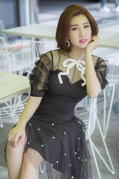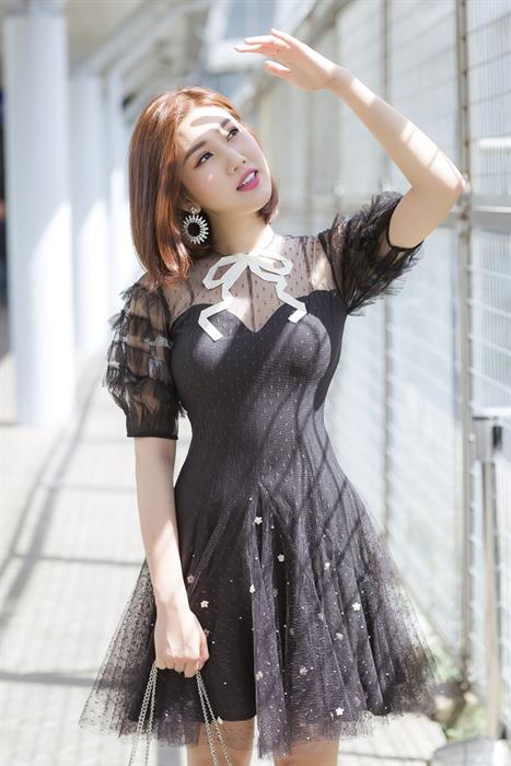 Thúy Ngân khoe nhan sắc mặn mà ở tuổi 29 với váy tông đen của nhà thiết kế Nguyễn Quảng. Chất liệu ren xuyên thấu mang đến cảm giác nhẹ nhàng, mềm mại. Những đường xếp nếp tinh tế hay chi tiết thắt nơ tôn nét nữ tính của phái đẹp. Thúy Ngân phối đồng điệu khuyên tai và giày, giúp tổng thể thêm cuốn hút.