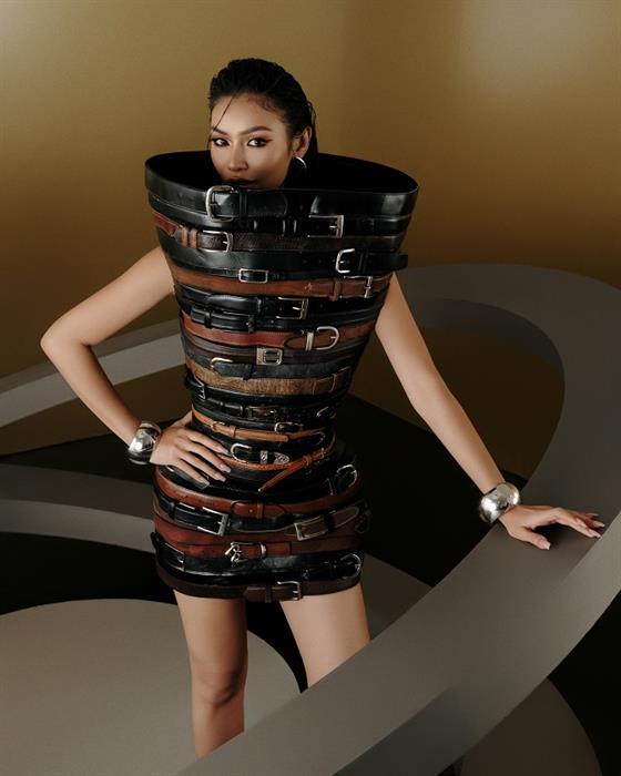 Cùng với đó, Hoa hậu Ketut Permata Juliastrid cũng rất cá tính với bộ outfit được tạo nên bởi những chiếc thắt lưng da tinh xảo. Những chất liệu quen thuộc như velvet, tulle, wool,… được làm mới với những kỹ thuật xử lý công phu như đính kết sequin lấp lánh, pha lê lộng lẫy và lông vũ mềm mại, tạo nên hiệu ứng thị giác cuốn hút. Qua từng khung hình, Hoa và Á hậu của Miss Cosmo 2024 khẳng định bản lĩnh với khả năng biến hóa đa dạng trong từng layout cùng kỹ năng “bắn ảnh” điêu luyện chẳng kém cạnh người mẫu high fashion chuyên nghiệp nào.