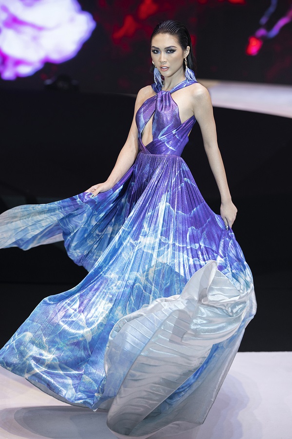 Hoa hậu gây bất ngờ khi thực hiện một cú xoay người 360 độ, tung váy kết hợp với những động tác múa quyến rũ,màn hình LED có sự thay đổi từ sắc xanh sang đỏ rực kết hợp với âm thanh dồn dập tạo hiệu ứng cho phần trình diễn, đem đến một hình ảnh vô cùng diễm lệ, khiến người xem liên tưởng đến những con sóng cuộn trào của đại dương.