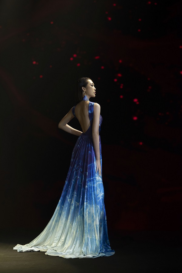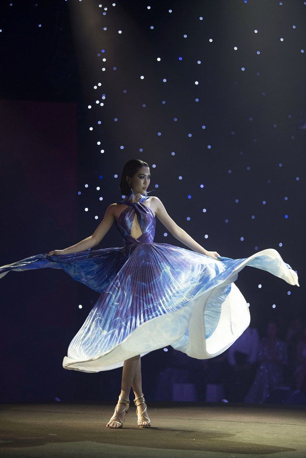 Tapchisaoviet - Tối qua, Hoa hậu sắc đẹp Châu Á 2017, Tường Linh, diện một thiết kế Haute Couture mang tông màu chủ đạo là trắng – xanh, màu sắc đặc trưng của biển cả, trình diễn mở màn trong phần diễn thứ 2 show thời trang của NTK Đỗ Long.