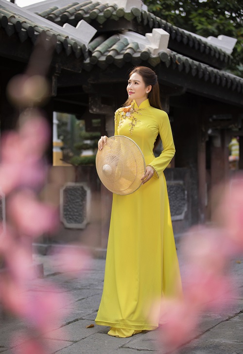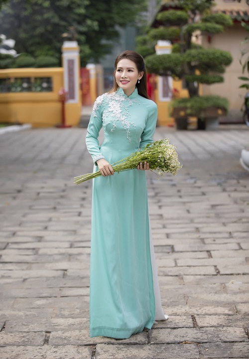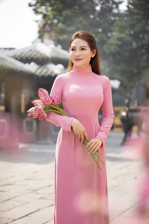 Cô chiêm ngưỡng công trình mang đậm kiến trúc cung đình Huế. Văn Phượng diện những bộ áo dài họa tiết đính kết hoa xuân có các tông màu đơn sắc.