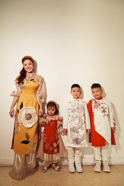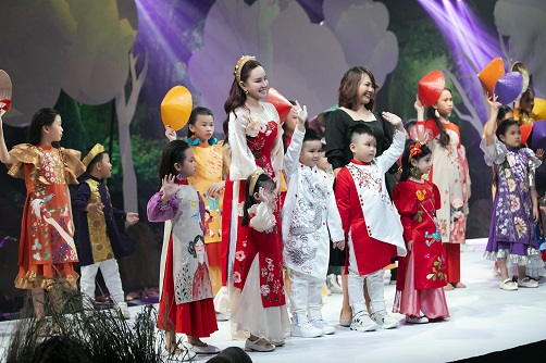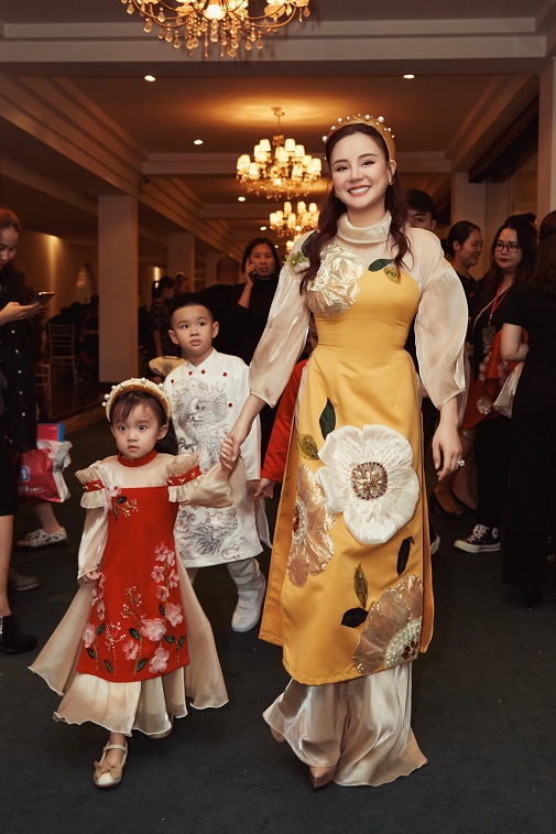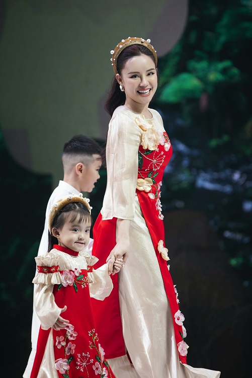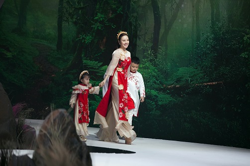 Đi catwalk cùng cô là hai con – bé Voi và bé Xu – cùng cháu trai Bond. Đây là lần đầu tiên nữ ca sĩ Đồng xanh đi catwalk cùng các con, cháu đồng thời đảm nhận vị trí vedette trong một show diễn thời trang. Trái với sự nghịch ngợm, hiếu động hôm thử đồ, cả hai con và cháu của Vy Oanh đều tỏ ra ngoan ngoãn, nghe lời khi làm mẫu. Lần đầu tiên diễn trên sàn catwalk nhưng các bé rất tự tin thể hiện những mẫu áo dài được Phương Nguyễn Silk đính kết cầu kỳ dành cho trẻ em. Với hình ảnh dễ thương, ngọt ngào, gia đình Vy Oanh nhận những tràng pháo tay không ngớt từ khán giả khi cùng nhau đi catwalk.