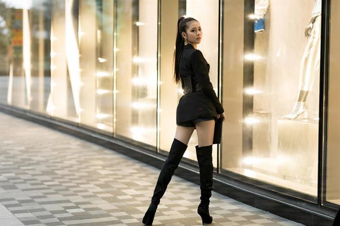 Cô diện cả cây đen với boot cao qua đùi, dùng phụ kiện kẹp tóc, khuyên tai và túi cầm tay cùng màu.