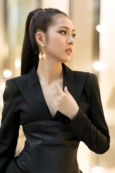 Nắm bắt được những thế mạnh của mình, Hoa hậu khai thác triệt để vòng eo 58, cô khéo léo lựa chọn những thiết kế chiết eo, ôm sát cơ thể. Với bộ trang phục màu đen, sự mạnh mẽ và thần thái như biết nói chứng tỏ khả năng làm chủ gương mặt và tương tác tốt với máy ảnh của cô.