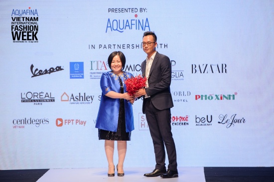Bà Trang Lê tặng hoa tri ân cho những thương hiệu đồng hành cùng Aquafina Vietnam International Fashion Week SS19