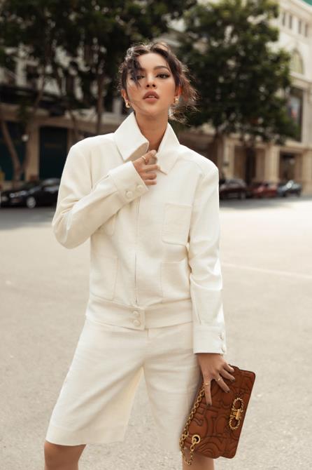 Khác với Châu Bùi, Khánh Linh lại theo đuổi phong cách menswear mang phong thái của một quý cô văn phòng hiện đại. Trên nền gam trắng của bộ suit bằng vải linen, Khánh Linh phối cùng một chiếc clutch màu đen có chi tiết kim loại mạnh mẽ. Cô đồng thời sử hoa tai to bản để khuôn mặt có điểm nhấn hơn, xét trên tổng thể trang phục trắng tinh khôi.