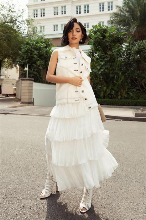 Khánh Linh trong một set trang phục gồm áo khoác gilet màu trắng, kết hợp cùng chân váy xếp pli nữ tính. Cô sử dụng túi xách và giày ton-sur-ton theo phong cách phối đồ white-on-white khá khó trong thời trang.