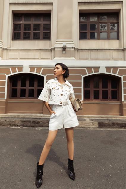 Set đồ gồm áo áo jacket phom lỡ hoạ tiết chấm bi được Châu Bùi kết hợp với quần shorts để tạo sự năng động và thoải mái. Cô kết hợp cùng túi xách màu beige trang nhã, hoà hợp với tổng thể trang phục.