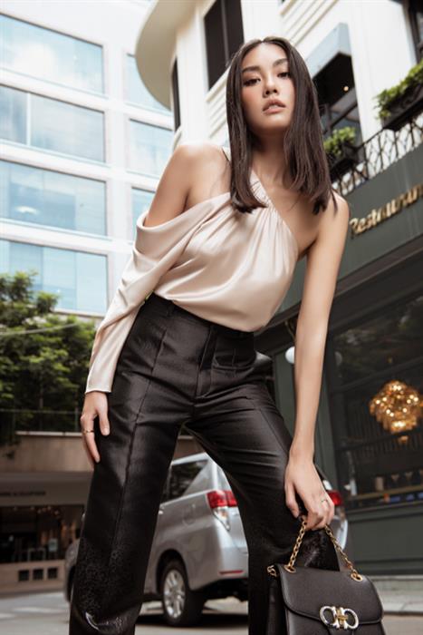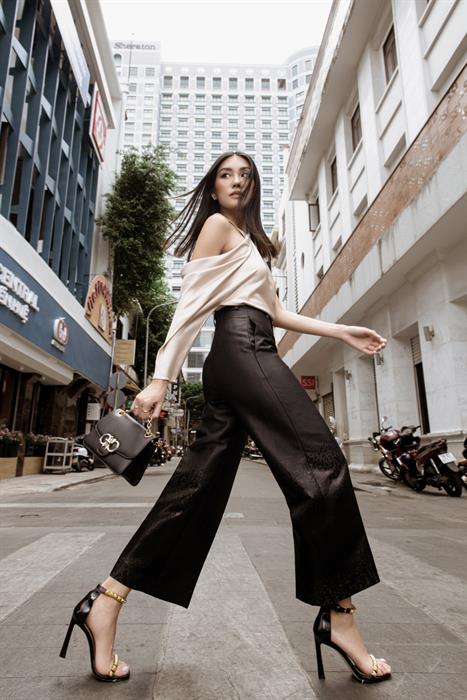 Chiếc áo lệch vai của nhà thiết kế Công Trí với điểm nhấn gợi cảm ở chi tiết cut-out ở cánh tay, khiến Thảo Nhi Lê trông đặc biệt thu hút mọi ánh nhìn. Nữ influencer khéo léo kết hợp cùng một chiếc quần suông màu đen đơn giản, cùng túi xách và giày tối màu để cân bằng lại tính chất của trang phục. Set trang phục của Thảo Nhi Lê không những thanh lịch, sang trọng nhưng vẫn khéo léo tôn vinh những điểm gợi cảm của phái đẹp.