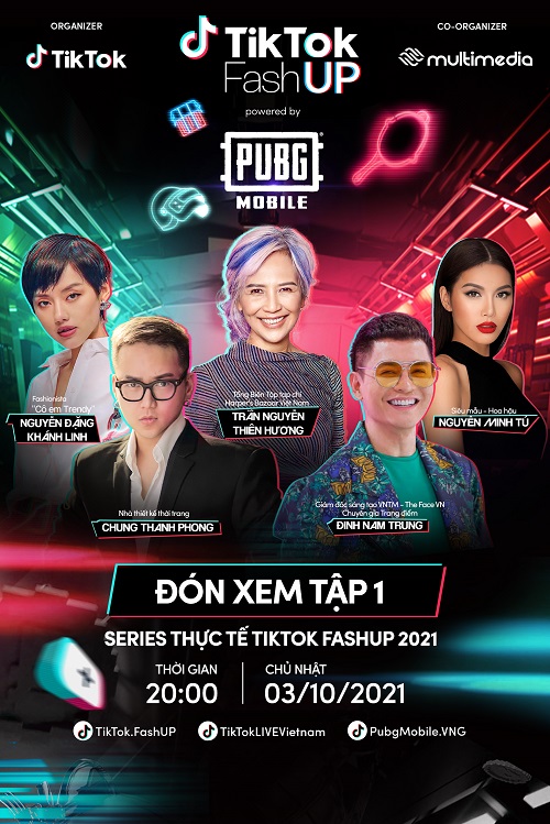 Tất cả sẽ có trong tập đầu tiên của Vòng bán kết ghi hình thực tế TikTok FashUP 2021 được chính thức lên sóng vào lúc 20h ngày 03/10/2021 trên kênh TikTok chính thức của TikTok FashUP 2021 https://www.tiktok.com/@tiktok.fashup?, kênh TikTok Live Việt Nam https://www.tiktok.com/@tiktoklivevietnam? và kênh TikTok của PUBG Mobile https://www.tiktok.com/@pubgmobile.vng?