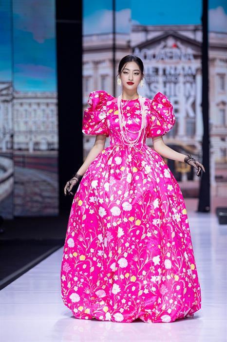 Trong quang cảnh của buổi tiệc trà chiều, Hoa hậu Thế Giới Việt Nam 2019 Lương Thùy Linh xuất hiện trong hình tượng một cô gái đầy kiêu hãnh và quyền lực. Hoa hậu Lương Thùy Linh được “chọn mặt gửi vàng” bởi nét đẹp hiện đại, giàu tri thức, đầy tự tin, dám đổi mới bản thân đúng như định nghĩa của Thương hiệu I.H.F về sự thanh lịch, rực rỡ. Hoa hậu sải bước catwalk trong chiếc đầm dạ hội xòe, nổi bật với tay áo phồng và tone màu hồng innuendo nhẹ nhàng được chấm phá bởi họa tiết hoa bắt mắt. Sự kết hợp táo bạo giữa nhiều sắc độ đã tạo nên một BST đầy sắc màu tôn lên được nét đẹp của quyến rũ của người phụ nữ.
