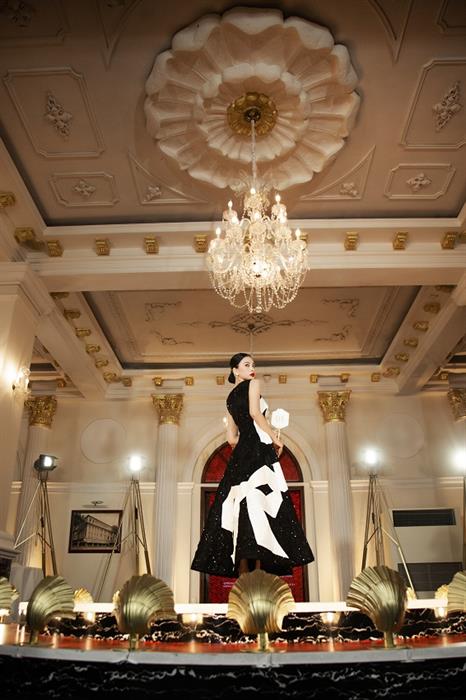 Giữa không gian cổ điển là tinh hoa kiến trúc của địa danh, triết lý về sự giao hoà di sản được nhà thiết kế Công Trí và đạo diễn Việt Tú đẩy đến tận cùng trong nghệ thuật trình diễn – người mẫu phô diễn các sáng tạo lụa là theo phong cách catwalk thập niên: họ cầm bảng số, thuyết minh về từng mẫu thiết kế, thanh tú sải bước trong khán phòng mang đậm tinh thần Pháp thế kỉ XIX.