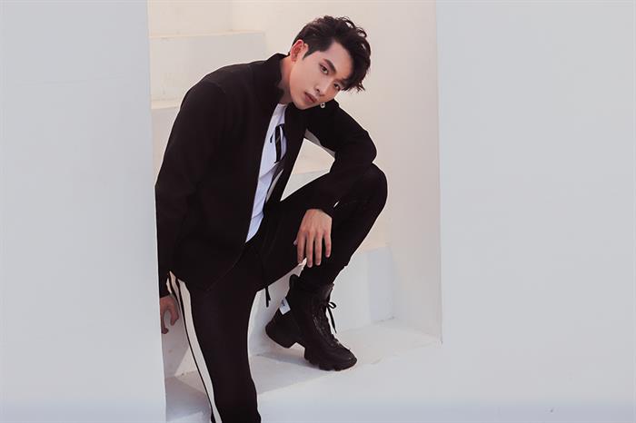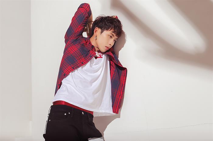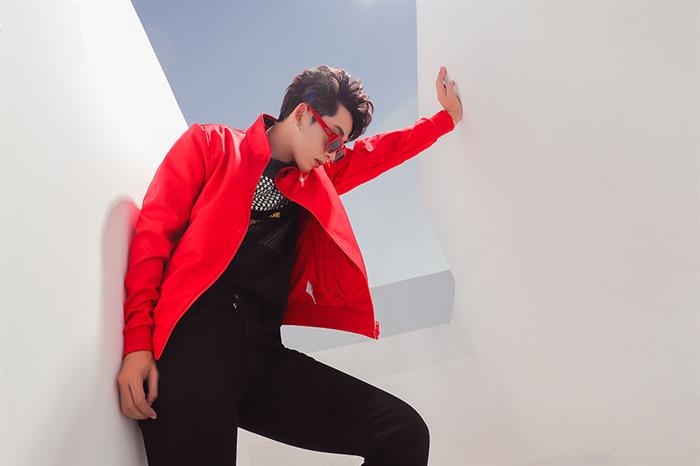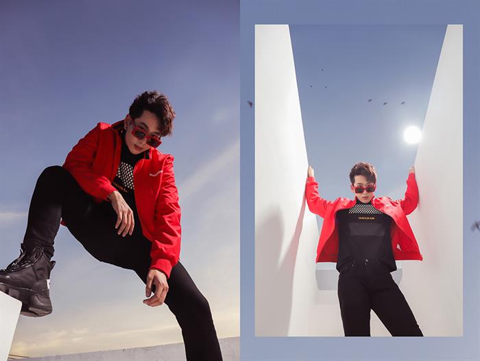 Trong bộ photobook này, Tuấn Trần chọn một bộ đồ đen basic với điểm nhấn nổi bật là áo bomber đỏ vừa chất chơi, vừa gọn gàng. Với áo thun, anh chàng luôn lựa chọn những loại thun tốt để khi giặt nhiều sẽ không bị nhão phom áo.