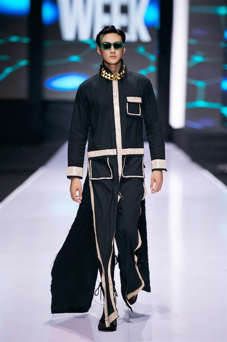 Bên cạnh đó, Quán quân The Face Vietnam 2018 Mạc Trung Kiên là người “cầm trịch” vị trí vedette của BST, và anh đã thể hiện xuất sắc tinh thần đối lập với các người mẫu khác khi sải từng bước catwalk chậm rãi để trình diễn một thiết kế mang gam màu đen khác biệt với cục diện của cả BST. Đây chính là cách mà tác giả muốn thể hiện sự tiếc nuối với những ký ức tuổi thơ rực rỡ đã đi vào dĩ vãng.