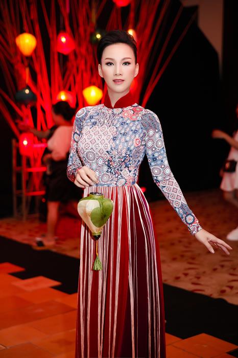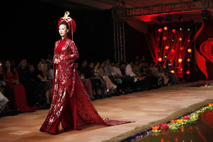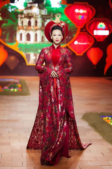 Đảm nhận vị trí vedette thể hiện thiết kế đinh nhất bộ sưu tập “Ánh trăng khai sáng”, hoa hậu Paris Vũ sải bước chuyên nghiệp trên đường băng. Người đẹp nổi bật trên sàn diễn với thiết kế tông đỏ “toàn tập”. Từ áo dài, quần, mấn đều là màu đỏ tượng trưng cho ánh trăng rực rỡ nhất đêm rằng. Không chỉ sở hữu chiều cao, vóc dáng của một model, Paris Vũ còn chứng tỏ khả năng người mẫu chưa bị mai một khi sải bước đi nhịp nhàng cùng điệu nhạc, thần thái cuốn hút. Bộ cánh đinh nhất BST giúp cựu người mẫu tự tin, trình diễn xuất thần dù 20 năm cô chia tay với sàn diễn.