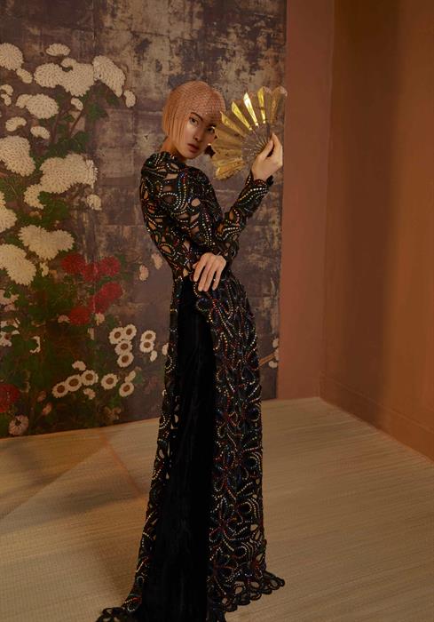 Phom dáng truyền thống được Công Trí xử lý với chất liệu vải lưới xuyên thấu, đắp chi tiết, hoa văn công phu thêu bằng tay. Trang phục tốn hàng trăm giờ để hoàn thiện, từ khâu làm chất liệu tới may, ráp các mảnh với nhau.