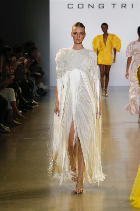 Bên cạnh nét rực rỡ của sắc vàng, thiết kế thứ hai thể hiện sự lịch lãm, nhẹ nhàng. Chỉ với màu vải trắng, thiết kế này vẫn mang lại chiều sâu về sắc độ qua kỹ thuật dập nổi, nhún gấp vải phù điêu, phối hợp với hàng tua rua mượt mà, dày dặn. Vải silk organza vốn mong manh, nên đễ thực hiện được kĩ thuât này là một sự kì công kiên nhẫn. Khi Caroline bước đi, chiếc đầm mang lại hiệu ứng chuyển động thú vị, hé lộ đôi chân dài sau đường xẻ cao vút.