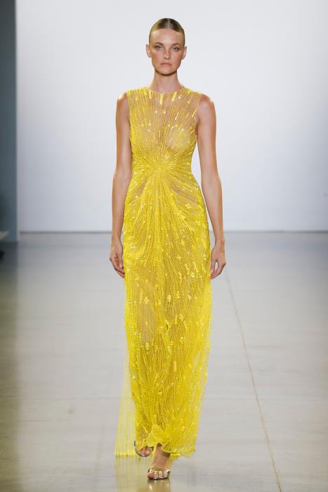 Chiếc đầm dạ hội màu vàng xuyên thấu có form dáng xoắn đơn giản, ôm sát, với điểm nhấn là dải vải vắt qua một bên vai. Màu vàng rực rỡ thu hút ánh nhìn từ xa, dần kéo sự chú ý tới những hàng sequin được đính kết tỉ mỉ, thanh mảnh, biến Caroline thành một vì tinh tú trong vắt.