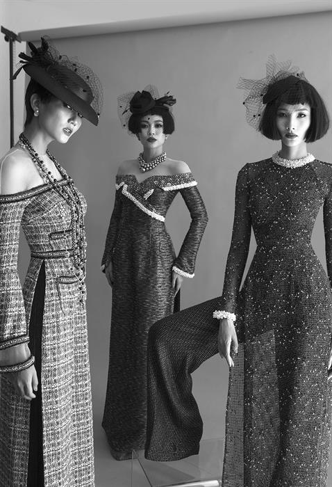 Những chiếc áo dài vải Tweed, Lụa và Gấm với đường lót được chần kỹ, sợi xích nhỏ được tết thủ công dằn dưới đường chân áo.
