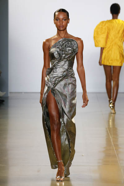 Thiết kế thứ 2 là trang phục dạ hội cúp ngực, cũng theo xu hướng ánh kim, từng dải vải được xếp và kết tay tỉ mỉ theo hình dáng của một bông hồng uốn lượn theo đường cong cơ thể. Đường xẻ và cắt cúp lại môt lần nữa tôn lên vóc dáng của Jasmine với tấm lưng nuột nà và đôi chân thẳng tắp.