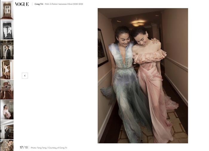 Hai nữ nghệ sĩ xuất hiện trong các thiết kế Công Trí trên Vogue tựa như ba dấu son tinh hoa của thời trang Việt Nam đang hoà làm một