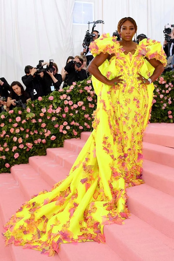 Một trong những chủ xị của Met năm nay, Serena Williams tỏa sáng với chiếc đầm sáng tạo với chất liệu phát sáng huỳnh quang được thêu bằng organza với sợi chỉ và pha lê Swarovski. Nhưng điểm đặc biệt nhất là cô mix đầm dạ hội của Versace cùng giày sneakers Nike.