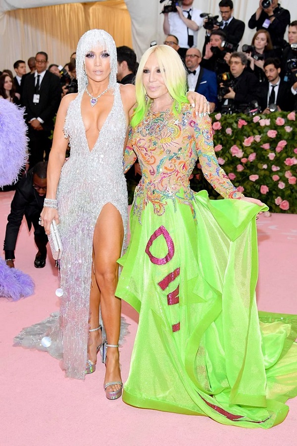 “Nữ hoàng nhạc Latin” Jennifer Lopez khoe trọn thân hình bốc lửa trứ danh của mình với bộ cánh ánh bạc lấp lánh mà Donatella Versace dành tặng riêng cho cô, phối cùng phụ kiện, giày và trang sức cùng tông.