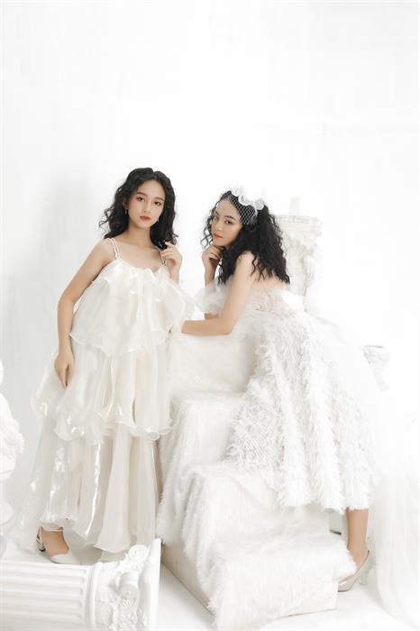 Hai mẫu nhí Thảo Vy và Phương Quyên trong bộ ảnh quảng bá cho thiết kế của Thạch Thảo
