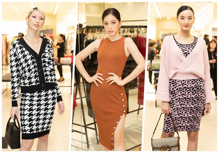 Nàng thơ Lê Thuý mang đến vẻ ngoài ngọt ngào với áo khoác phối cùng váy ôm hoạ tiết với chất liệu dệt kim.