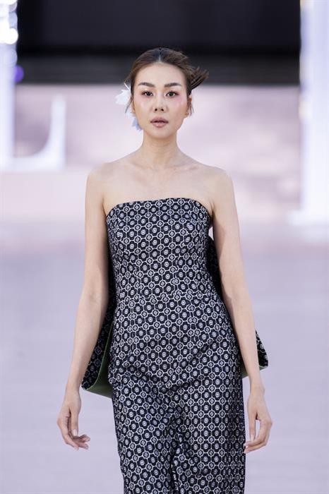 BST “Charm” của thương hiệu đến từ Indonesia PEGGY HARTANTO tiếp nối mạch cảm xúc bay bổng với những thiết kế trang phục có phom dáng nữ tính cùng nhiều chi tiết hình học, họa tiết và màu sắc tươi vui. Lấy cảm hứng từ lễ hội cầu điều lành cho những bé gái Hinano Tsurushi Kazari của vùng Inatori ở Nhật Bản, BST Xuân Hè 2024 của Peggy Hartanto mang đến những phom dáng đa dạng, uyển chuyển với họa tiết chính là những chiếc nơ mềm mại và rất nhiều đường cong vui nhộn, một chi tiết thiết kế đặc trưng của thương hiệu. Siêu mẫu Thanh Hằng là nhân vật vedette kết màn cho phần trình diễn của Peggy Hartanto khi xuất hiện trong một chiếc đầm dài dáng ôm thanh thoát và gợi cảm.