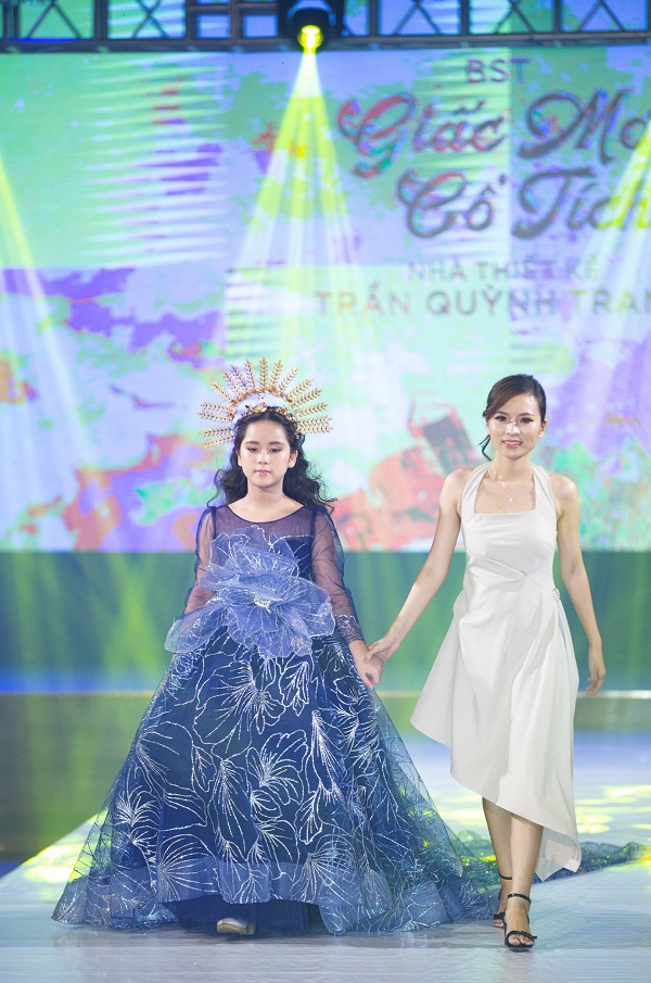 BST thứ nhất có tên gọi “Giấc mơ cổ tích” lấy ý tưởng ban đầu là những nàng công chúa, thần tiên, mặc những trang phục lấp lánh, huyền ảo như bước ra từ câu chuyện cổ tích. Tuy nhiên, thay vì bó buộc với tông màu pastel quen thuộc thì BST sẽ tập trung vào những tông màu độc đáo như xanh, gold, lấp lánh dưới ánh đèn, đó là ý tưởng mà NTK Trần Quỳnh Trang đã ấp ủ từ rất lâu.