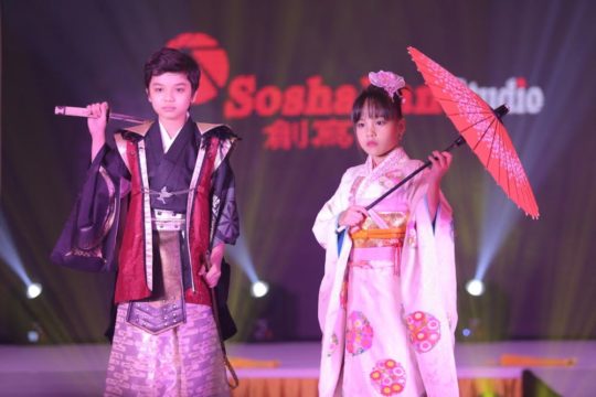 Mở màn là bộ sưu tập Kimono đến từ thương hiệu Soshakan Studio với sự trình diễn của các mẫu nhí. Trên nền nhạc vui tươi, những bộ trang phục kimôn kết hợp với guốc mộc, túi xách, kiếm, dù…đã đưa cả hội trường đến không gian Nhật Bản vô cùng xinh đẹp.