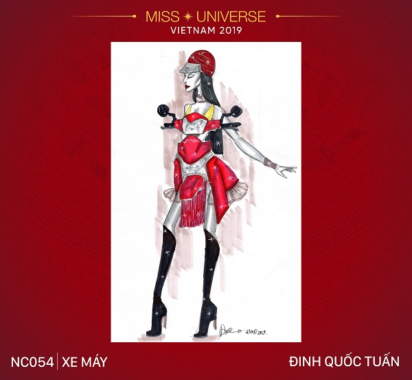 Phương tiện giao thông không phải là chủ đề mới tại Miss Universe nhưng Đinh Quốc Tuấn (sinh năm 2002, Thái Nguyên) vẫn muốn mang “Xe máy” – loại phương tiện giao thông phổ biến nhất tại Việt Nam đến với cuộc thi. Hình ảnh nón bảo hiểm mang lại nhiều cảm xúc cho khán giả vì bất cứ ai khi ra đường cũng đều phải sử dụng. Cách điệu hình ảnh xe máy trở thành trang phục mặc lên người, bài thi là sự sáng tạo độc đáo của Quốc Tuấn dù chỉ mới 18 tuổi.