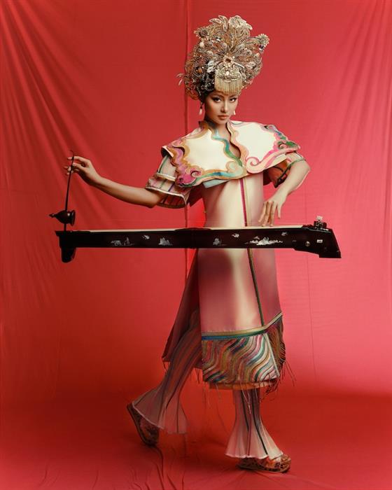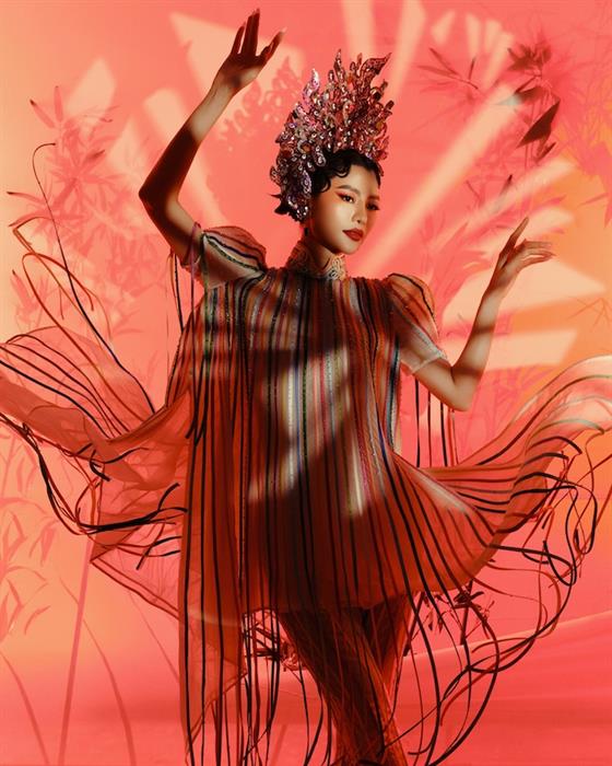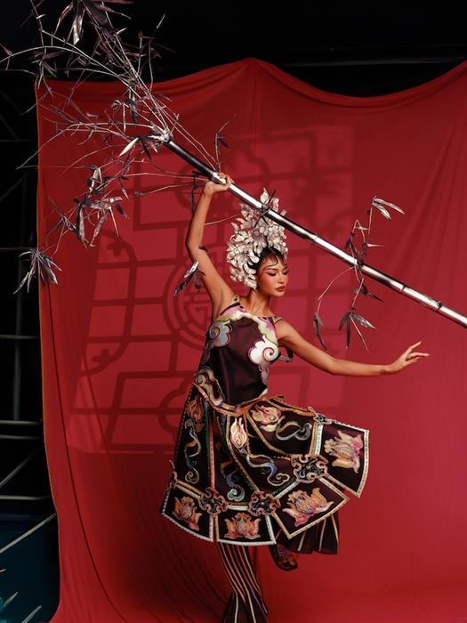 Bộ ảnh không chỉ gây ấn tượng bởi những thiết kế độc đáo mà còn bởi sự kết hợp tinh tế với các đạo cụ mang đậm dấu ấn văn hóa Việt Nam. Hình ảnh Hoa hậu Ketut Permata Juliastrid và Á hậu Karnruethai Tassabut đầy khí chất bên những luỹ tre – biểu tượng của sự kiên cường và tinh thần dân tộc – nổi bật không gian truyền thống, tôn lên vẻ đẹp dung dị nhưng đầy sức sống. Hay khoảnh khắc Hoa hậu Bùi Xuân Hạnh thả dáng bên chiếc đàn bầu – nhạc cụ dân tộc gắn liền với tâm hồn người Việt – cũng trở thành điểm nhấn, tạo nên sự hòa quyện giữa âm nhạc truyền thống và vẻ đẹp của nghệ thuật thị giác. Những đạo cụ này không chỉ bổ sung chiều sâu nghệ thuật cho bộ ảnh mà còn khắc họa tinh thần gìn giữ và lan tỏa giá trị văn hóa truyền thống. Từng khung hình là sự giao thoa hài hòa giữa thời trang và văn hóa, giữa truyền thống và hiện đại, mang đến thông điệp về sự trường tồn của bản sắc Việt trong dòng chảy nghệ thuật đương đại.